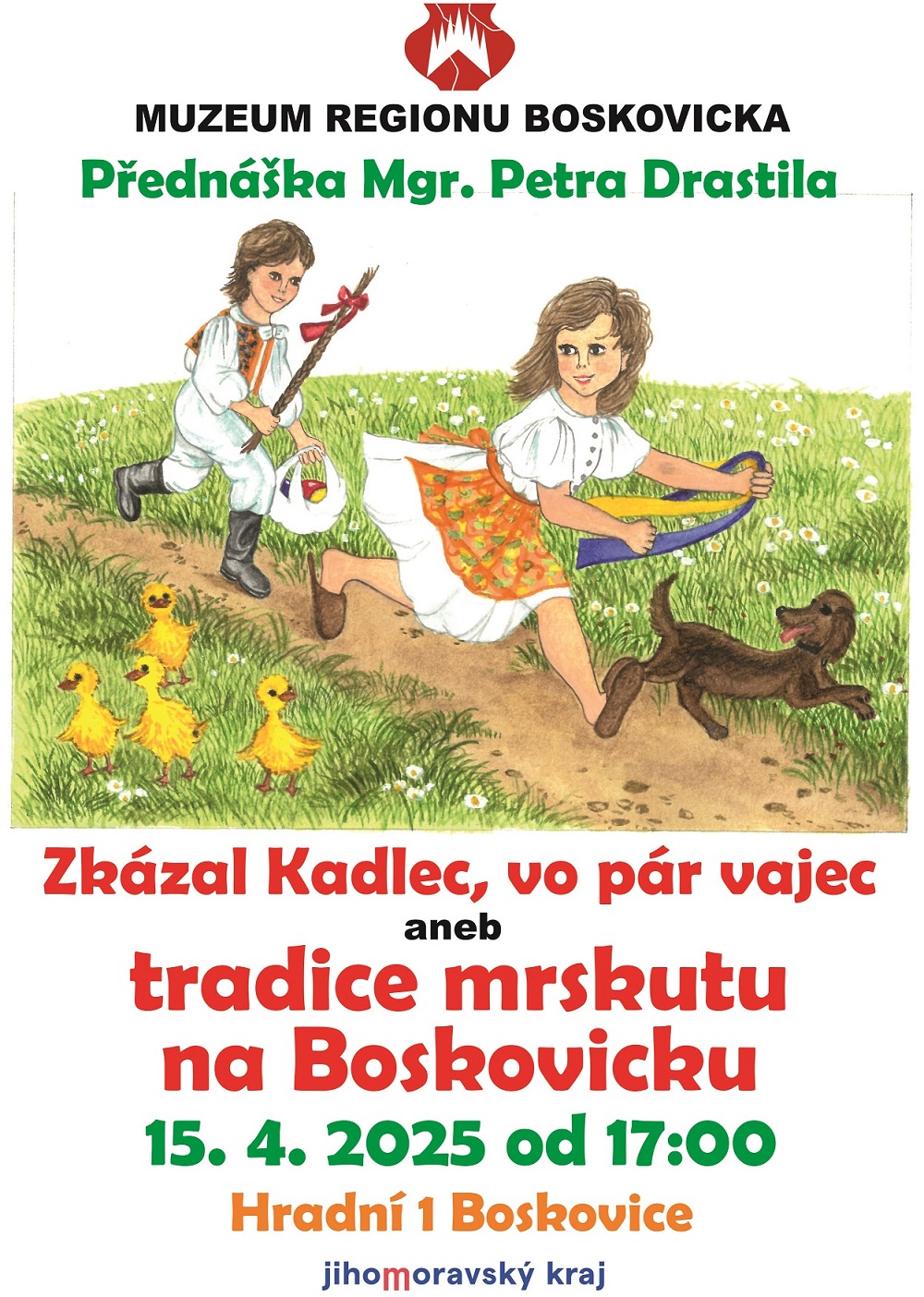 - přednášku Mgr. Petra Drastila Zkázal Kadlec, vo pár vajec aneb tradice mrskutu na Boskovicku, dne 15. 4. 2025 od 17 hodin v muzeu Hradní 1, Boskovice.